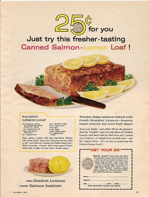 When I was going through some of those vintage mags for scanning, I came across an ad featuring my childhood nemisis: Salmon Loaf!